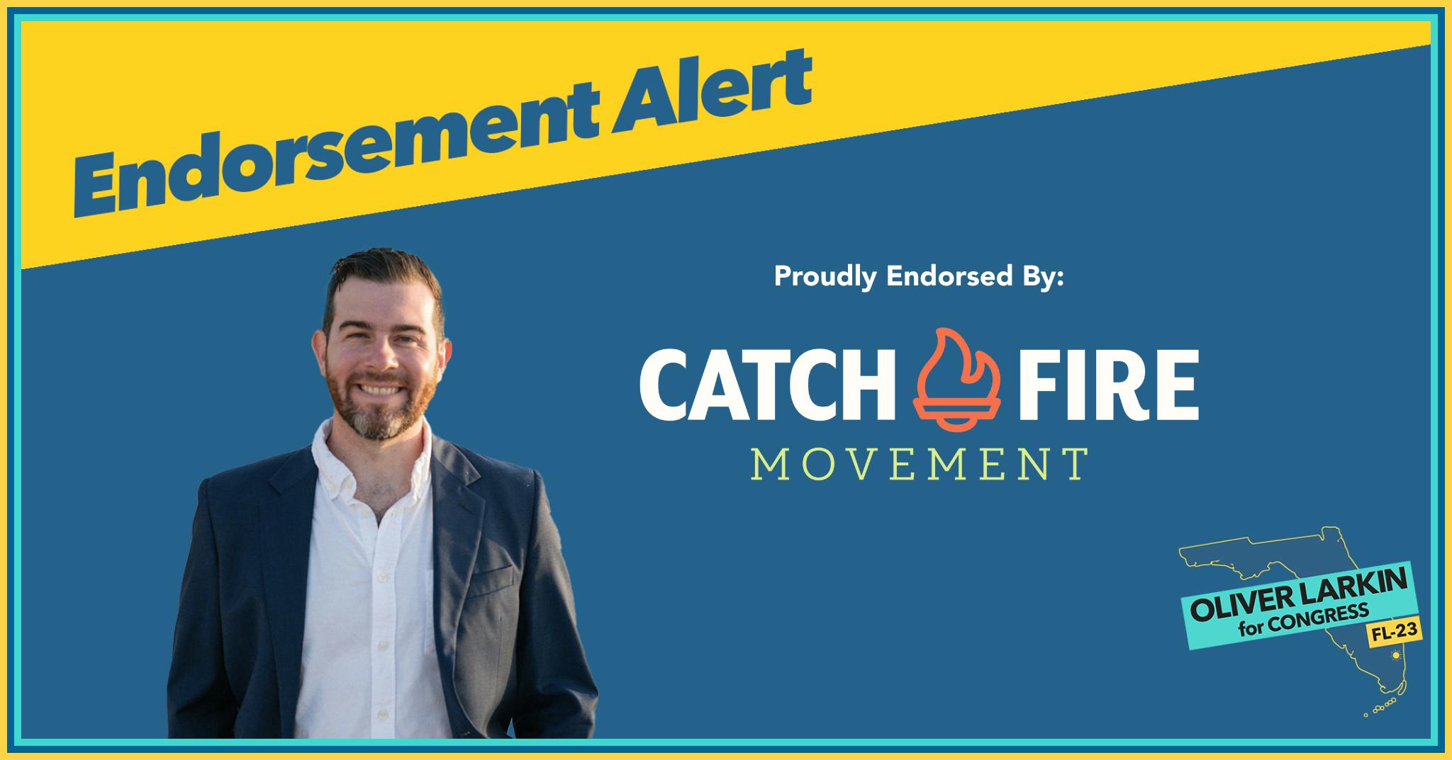Deerfield Beach, FL — Oliver Larkin’s Democratic campaign for Congress in Florida’s 23rd U.S. House district announced the endorsement of Catch Fire Movement, a 501(c)(4) non-profit organization dedicated to building a pipeline for progressive electoral leadership.